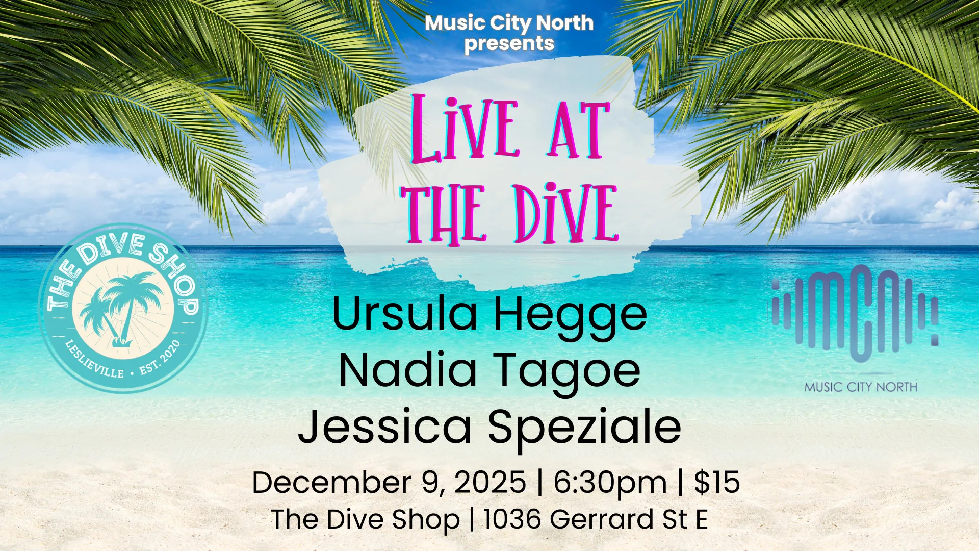 This is a treat! Not only do we have one of our favourite artists ever playing, Jessica Speziale, we have two fresh faces that we are absolutely stoked to have join us: Ursula Hegge and Nadia Tagoe. This is our last show of 2025 and on a Tuesday night as opposed to our typical Wednesday. The bar is decked out for the holidays complete with a festive menu for both cocktails and eats. It’s going to be a great night, so come on out and be part of something magical!